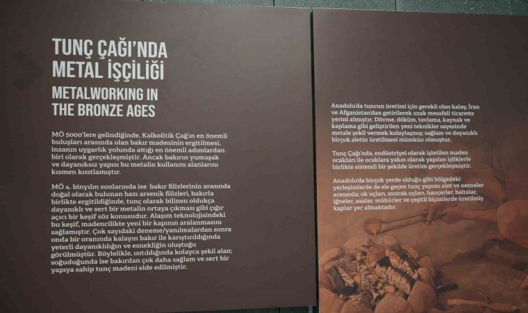 Samsun Müzesinde Tunç Çağı metal işçiliği ile ilgili bilgilendirmede, “Anadolu’da tuncun üretimi için gerekli olan kalay, İran ve Afganistan’dan getirilerek uzak mesafeli ticarette yerini almıştır. Dövme, döküm, tavlama, kaynak ve kaplama gibi geliştirilen yeni teknikler sayesinde metale şekil vermek kolaylaşmış, sağlam ve dayanıklı birçok aletin üretilmesi mümkün olmuştur. Tunç Çağı’nda endüstriyel olarak işletilen maden ocakları ile ocaklara yakın olarak yapılan işliklerle birlikte sistemli bir şekilde üretim gerçekleşmiştir. Anadolu’da birçok yerde olduğu gibi bölgedeki yerleşimlerde de ele geçen tunç yapımı alet ve nesneler arasında ok uçları, mızrak uçları, hançerler, baltalar, iğneler, asalar, mühürler ile çeşitli biçimde üretilmiş yapılar yer almaktadır” ifadeleri yer aldı.