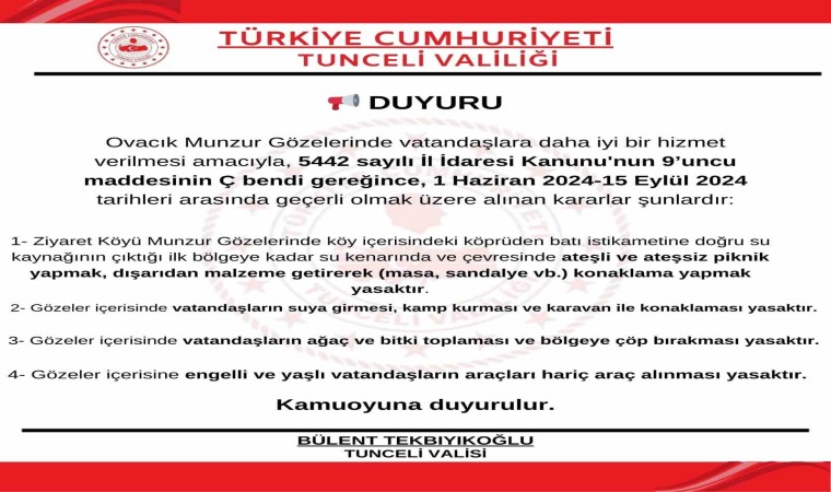 Tunceli Valiliğinden yapılan açıklamada, Ovacık ilçesi Munzur gözelerinde vatandaşlara daha iyi hizmet verilmesi amacıyla 5442 sayılı İl İdaresi Kanunu’nun 9’uncu maddesi Ç bendi gereğince 1 Haziran-15 Eylül tarihleri arasında geçerli olmak üzere karar alındığı belirtildi. Açıklamada, ‘’Ziyaret köyü Munzur gözelerinde köy içerisindeki köprüden batı istikametine doğru su kaynağının çıktığı ilk bölgeye kadar su kenarında ve çevresinde ateşli ve ateşsiz piknik yapmak, dışarıdan malzeme getirerek konaklama yapmak yasaktır. Gözeler içerisinde vatandaşların suya girmesi, kamp kurması, karavan ile konaklaması yasaktır. Gözeler içerisinde vatandaşların ağaç ve bitki toplaması ile bölgeye çöp bırakması yasaktır. Gözeler içerisinde engelli ve yaşlı vatandaşların araçları hariç araç kullanılması yasaktır’’ denildi.