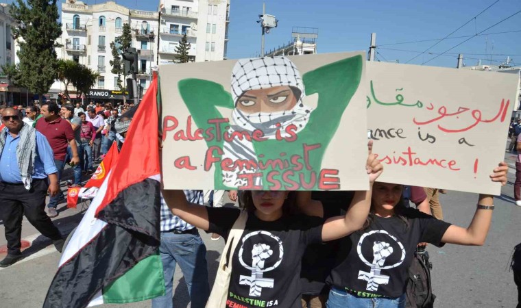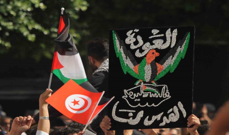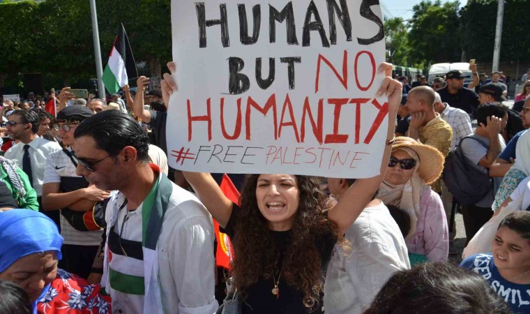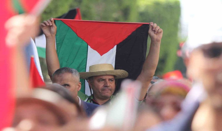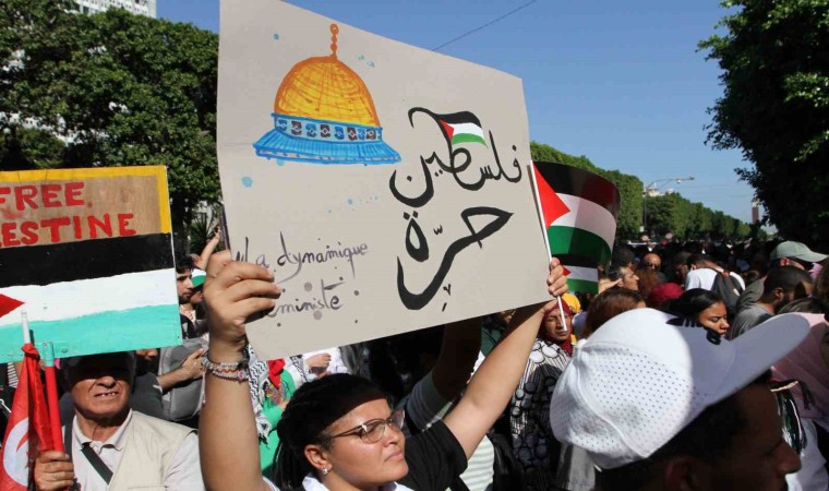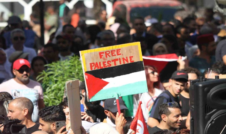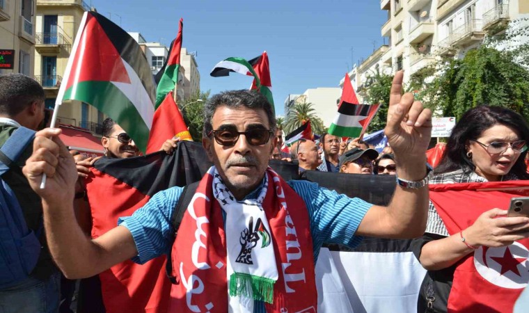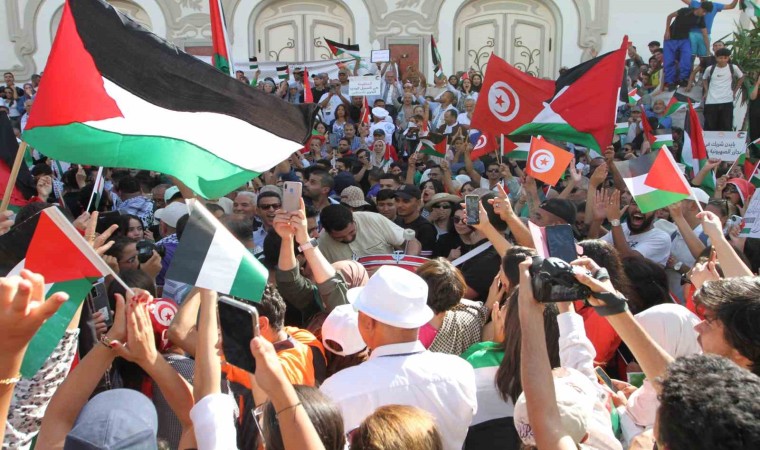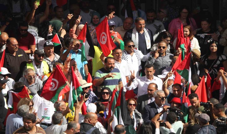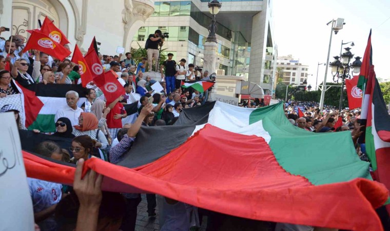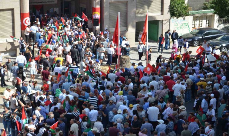 Tunus Genel İşçi Sendikası’nın merkez binası önünde toplanan göstericiler, başkentin sembol mekanlardan Habib Burgiba Caddesi’ne yürüdü. Filistin’e destek sloganları atan göstericiler, İsrail ile normalleşmeyi suç sayan bir yasanın çıkarılması çağrısında bulundu.