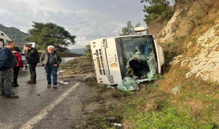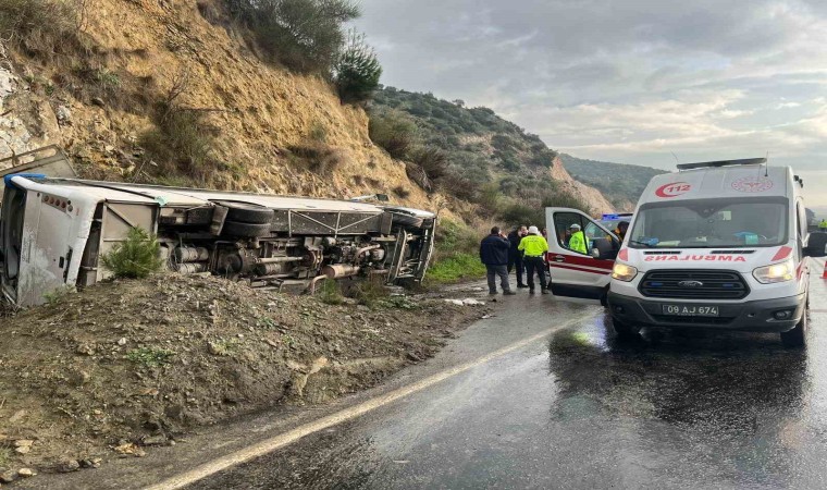 Aydın’ın Germencik ilçesinde İzmir’deki festivale giden tur minibüsü yağış nedeniyle kayganlaşan yolda devrilirken, kazada 23 kişi yaralandı.
