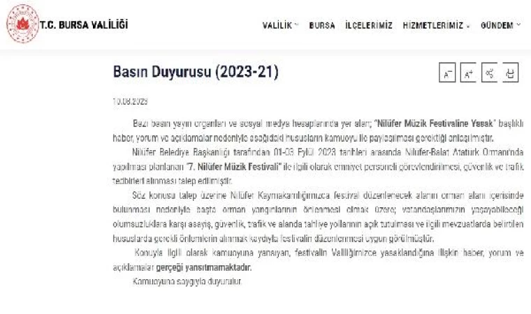 Bursa Valiliği, Nilüfer Belediyesi'nce eylül ayında yapılacağı duyurulan 7'nci Nilüfer Müzik Festivali'nin kaymakamlıkça getirilen 'kamp' ve 'alkol' yasağı sonrası protesto amacıyla iptal edilmesine ilişkin açıklama yaptı. Valilikten yapılan yazılı açıklamada, "Bazı basın yayın organları ve sosyal medya hesaplarında yer alan; 'Nilüfer Müzik Festivaline Yasak' başlıklı haber, yorum ve açıklamalar nedeniyle aşağıdaki hususların kamuoyu ile paylaşılması gerektiği anlaşılmıştır. Nilüfer Belediye Başkanlığı tarafından 01-03 Eylül 2023 tarihleri arasında Nilüfer-Balat Atatürk Ormanı'nda yapılması planlanan '7. Nilüfer Müzik Festivali' ile ilgili olarak emniyet personeli görevlendirilmesi, güvenlik ve trafik tedbirleri alınması talep edilmiştir. Söz konusu talep üzerine Nilüfer Kaymakamlığımızca festival düzenlenecek alanın orman alanı içerisinde bulunması nedeniyle başta orman yangınlarının önlenmesi olmak üzere; vatandaşlarımızın yaşayabileceği olumsuzluklara karşı asayiş, güvenlik, trafik ve alanda tahliye yollarının açık tutulması ve ilgili mevzuatlarda belirtilen hususlarda gerekli önlemlerin alınmak kaydıyla festivalin düzenlenmesi uygun görülmüştür. Konuyla ilgili olarak kamuoyuna yansıyan, festivalin Valiliğimizce yasaklandığına ilişkin haber, yorum ve açıklamalar gerçeği yansıtmamaktadır" denildi. (DHA)