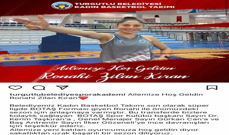 Kurulduğu günden bu yana basketbol camiasında önemli bir yer edinen ve yaptığı transferlerle ses getiren Turgutlu Belediyespor Kadın Basketbol takımı Ronahi Zilan Kıran’ı transfer etti. Sezon hazırlıklarını kendi tesislerinde sürdüren Belediyespor’da yönetim transferde önemli isimleri takıma dahil etmek için yoğun bir mesai harcıyor. Play off hattının gediklisi olan Turgutlu Belediyespor Kadın Basketbol Takımı en son Süper Lig ekiplerinden BOTAŞ forması giyen Ronahi Zilan Kıran’ı renklerine bağlayarak gücüne güç kattı.