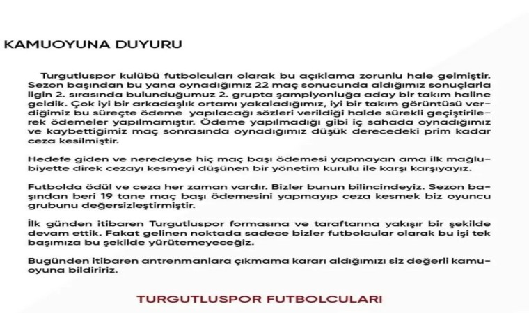 Turgutluspor futbolcularını yaptığı açıklamada, “Turgutluspor kulübü futbolcuları olarak bu açıklama zorunlu hale gelmiştir. Sezon başından bu yana oynadığımız 22 maç sonucunda aldığımız sonuçlarla ligin 2. sırasında bulunduğumuz 2. Grup’ta şampiyonluğa aday bir takım haline geldik. Çok iyi bir arkadaşlık ortamı yakaladığımız, iyi bir takım görüntüsü verdiğimiz bu süreçte ödeme yapılacağı sözleri verildiği halde sürekli geçiştirilerek ödemeler yapılmamıştır. Ödeme yapılmadığı gibi iç sahada oynadığımız ve kaybettiğimiz maç sonrasında oynadığımız düşük derecedeki prim kadar ceza kesilmiştir. Hedefe giden ve neredeyse hiç maç başı ödemesi yapmayan ama ilk mağlubiyette direk cezayı kesmeyi düşünen bir yönetim kurulu ile karşı karşıyayız. Futbolda ödül ve ceza her zaman vardır. Bizler bunun bilincindeyiz. Sezon başından beri 19 tane maç başı ödemesini yapmayıp ceza kesmek biz oyuncu grubunu değersizleştirmiştir. İlk günden itibaren Turgutluspor formasına ve taraftarın yakışır bir şekilde devam ettik. Fakat gelinen noktada sadece bizler futbolcular olarak bu işi tek başımıza bu şekilde yürütemeyeceğiz. Bugünden itibaren antrenmanlara çıkmama kararı aldığımızı siz değerli kamuoyuna bildiririz” ifadelerine yer verildi.
