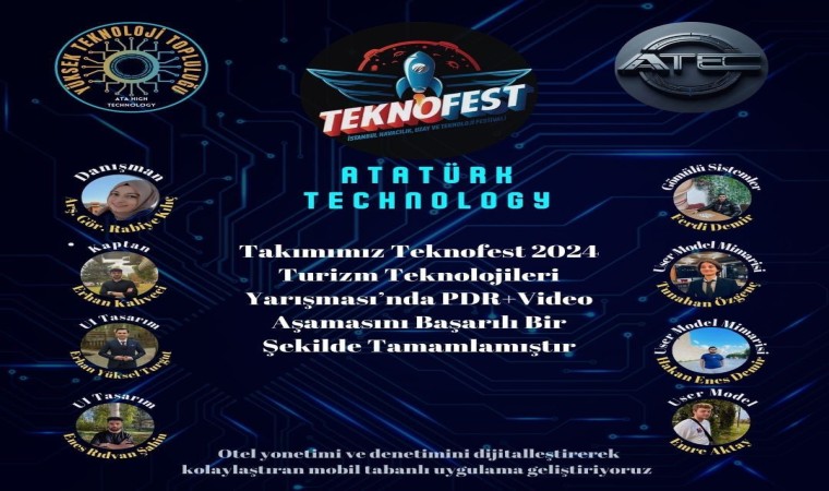 Atatürk üniversitesi Mühendislik Fakültesi bünyesinde faaliyet gösteren Yüksek Teknoloji Topluluğuna bağlı ATEC ekibi, TEKNOFEST 2024 Turizm Teknolojileri Kategorisinde PDR + Video aşamasını 85.33’lük puanla geçerek Antalya’da gerçekleşecek olan TEKNOFEST 2024 Turizm Teknolojileri Finallerine katılmaya hak kazandı ve önemli bir başarıya imza attı.