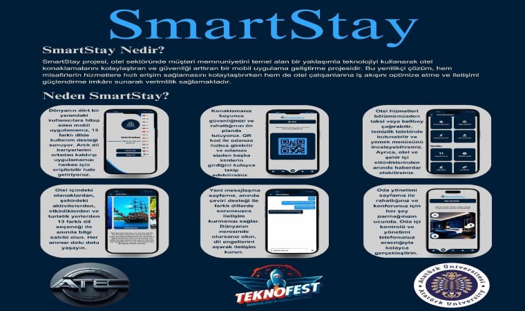 Arş. Gör. Rabiye Kılıç’ın danışmanlığını yaptığı ATEC, Erhan Kahveci, Erhan Yüksel Turgut, Enes Rıdvan Şahin, Ferdi Demir, Tunahan Özgenç, Hakan Enes Demir, Emre Aktay’dan oluşan ekibiyle geliştirdiği SmartStay; kullanıcı dostu ara yüzü ve özgün özellikleriyle, otel sektöründe teknolojiyle iç içe bir dönüşümü temsil ederek, müşteri memnuniyetini artırırken işletmelerin rekabet avantajını güçlendirmeyi amaçlıyor.