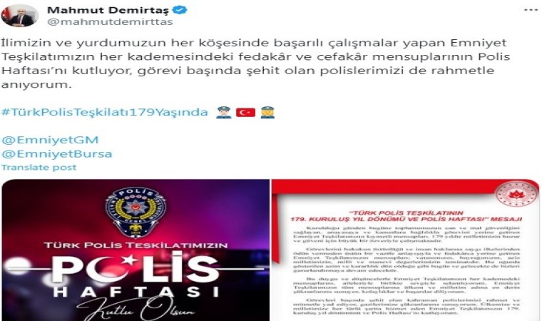Polis ekiplerinin hatıra fotoğrafı çekilmesiyle tören son bulurken, Bursa Valisi Mahmut Demirtaş sosyal medya hesabından yaptığı açıklamada, “İlimizin ve yurdumuzun her köşesinde başarılı çalışmalar yapan Emniyet Teşkilatımızın her kademesindeki fedakâr ve cefakâr mensuplarının Polis Haftası’nı kutluyor, görevi başında şehit olan polislerimizi de rahmetle anıyorum” ifadelerini kullandı.