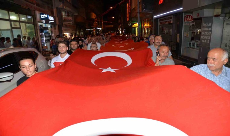 Akşam 15 Temmuz Şehitleri Kent Meydanı’nda düzenlenen anma programı öncesi kortej yürüyüşü gerçekleştirildi. Protokol üyeleri ve vatandaşlar, ellerinde Türk bayrakları ve meşaleler ile kortej yürüyüşü gerçekleştirdi.