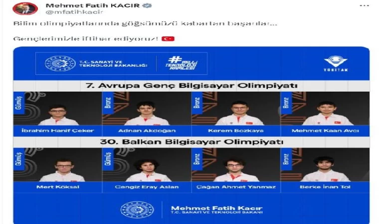 Bakan Kacır, yaptığı yazılı açıklamada, Gürcistan’ın Kutaisi kentinde 8-14 Eylül'de düzenlenen 24 ülkeden 92 öğrencinin katıldığı; 7'nci Avrupa Genç Bilgisayar Olimpiyatı’nda Türkiye’yi temsil eden öğrencilerin 1 gümüş ve 3 bronz madalya kazandığını bildirdi. Kacır, 29 Ekim-03 Kasım 2023 tarihlerinde Slovenya’nın Maribor şehrinde 17 ülkeden 74 öğrencinin katılımıyla gerçekleştirilen 30’uncu Balkan Bilgisayar Olimpiyatı’nda 2 gümüş ve 2 bronz madalya kazanıldığını ifade etti. Türkiye’nin 7'nci Avrupa Genç Bilgisayar Olimpiyatı’nda bir kez daha teknolojideki üstün yeteneklerini kanıtladığını belirten Kacır, "Genç bilim insanlarımızın bu uluslararası platformda elde ettiği 1 gümüş ve 3 bronz madalya gurur verici. Ülkemizi temsil eden İbrahim Hanif Çeker'i gümüş madalyasıyla, Adnan Akdoğan, Kerem Bozkaya ve Mehmet Kaan Avcı'yı ise bronz madalyalarıyla gönülden tebrik ediyorum" dedi.