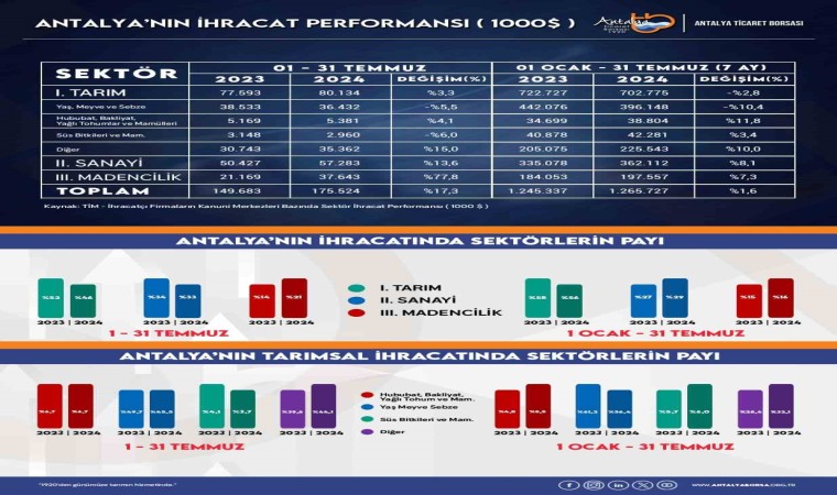 Antalya Tarım Konseyi Başkanı Ali Çandır, 2024 Temmuz ayında bir önceki aya göre; yaş meyve sebze ihracatının Türkiye’de yüzde 20,8, Antalya’da yüzde 21,8 azaldığını kaydetti. Çandır, “Süs bitkileri ve mamulleri ihracatı Türkiye’de yüzde 21,1 azalırken, Antalya’da yüzde 25,8 azaldı. Toplam tarım ve gıda ihracatı Türkiye’de yüzde 17,1 artarken, Antalya’da yüzde 4,9 azaldı. Sanayi ihracatı Türkiye’de yüzde 20 artarken, Antalya’da yüzde 7 arttı. Maden ihracatı Türkiye’de yüzde 31,5 artarken, Antalya’da yüzde 46,6 arttı. Toplam ihracat Türkiye’de yüzde 19,9 artarken, Antalya’da yüzde 5 arttı” dedi.