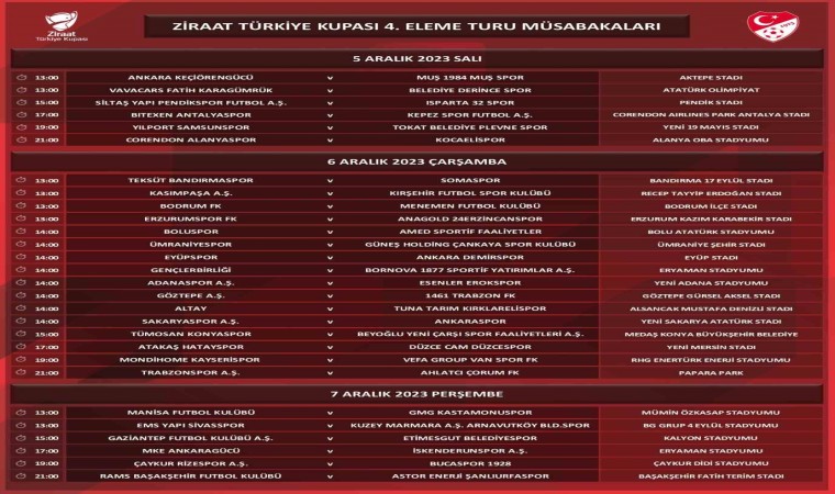 Ziraat Türkiye Kupası’nda 4. tur maçlarının programı açıklandı. Karşılaşmalar 5-7 Aralık tarihlerinde oynanacak.