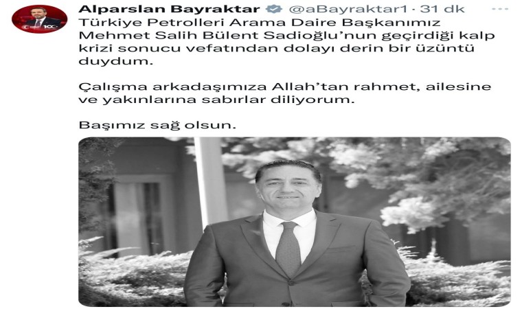 Enerji ve Tabii Kaynaklar Bakanı Alparslan Bayraktar X hesabında yaptığı açıklamada, “Türkiye Petrolleri Arama Daire Başkanımız Mehmet Salih Bülent Sadioğlu’nun geçirdiği kalp krizi sonucu vefatından dolayı derin bir üzüntü duydum. Çalışma arkadaşımıza Allah’tan rahmet, ailesine ve yakınlarına sabırlar diliyorum. Başımız sağ olsun” ifadelerini kullandı.