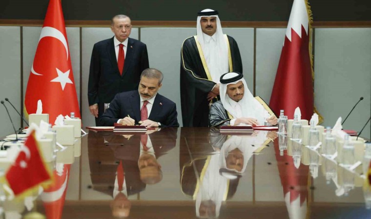 Cumhurbaşkanı Recep Tayyip Erdoğan’ın resmi temaslarda bulunmak üzere geldiği Katar’da Türkiye ile Katar arasında diplomatik ilişkilerin kurulmasının 50’nci yıldönümü münasebetiyle ortak bildiri imzalandı. Cumhurbaşkanı Erdoğan ile Katar Emiri Şeyh Tamim bin Hamad Al Thani arasındaki heyetlerarası görüşmenin başında imzalanan bildiriye Türkiye adına Dışişleri Bakanı Hakan Fidan, Katar adına ise Katar Başbakanı ve Dışişleri Bakanı Ekselansları Şeyh Muhammed bin Abdulrahman bin Jassim Al Thani imza attı.
