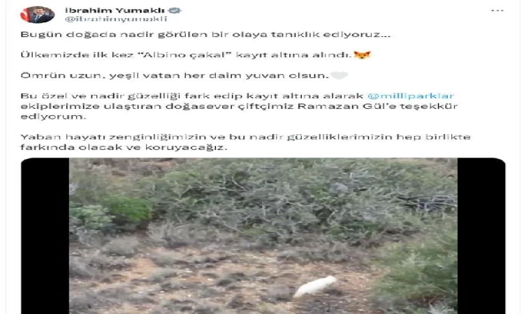 Bakan Yumaklı, sosyal medya hesabından yaptığı açıklamada, "Bugün doğada nadir görülen bir olaya tanıklık ediyoruz. Ülkemizde ilk kez 'Albino çakal' kayıt altına alındı. Ömrün uzun, yeşil vatan her daim yuvan olsun. Bu özel ve nadir güzelliği fark edip kayıt altına alarak Doğa Koruma ve Milli Parklar Genel Müdürlüğü ekiplerimize ulaştıran doğasever çiftçimiz Ramazan Gül'e teşekkür ediyorum. Yaban hayatı zenginliğimizin ve bu nadir güzelliklerimizin hep birlikte farkında olacak ve koruyacağız" dedi. (DHA)