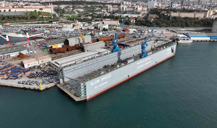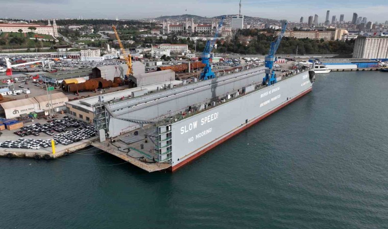Rus nükleer buzkıranların tamirinde kullanılabilecek İstanbul’da üretilen 222 metre uzunluğundaki dev yüzer havuz Haydarpaşa Limanı’nda göreve gitmeyi bekliyor. 8 katlı bir apartman yüksekliğindeki dev yüzer havuzun büyüklüğü dron kamerasıyla gözler önüne serildi.