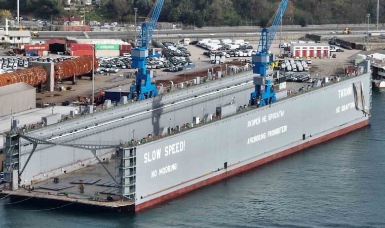 Rus ve Türk şirketlerinin anlaşması sonucu 29 ayda Tuzla’da üretilen dev yüzer havuz gideceği görev yeri için Haydarpaşa Limanı’nda bekliyor. 11 bin 350 ton ağırlığındaki yüzer havuz, 222 metre uzunluğunda 48 metre genişliği ile 30 bin ton taşıma kapasitesine sahip. İçerisinde 30 mürettebatın görev yapması planlanan dev yüzer havuz, Rus nükleer buzkıranların bakım onarımında kullanılabilecek kapasiteye sahip. Görev yerine gideceği zamana kadar Haydarpaşa Limanı’nda bekleyen dev yüzer havuz üzerinde iki adet vinç bulunuyor. Havuzun yan kısımlarında İngilizce ve Rusça, yavaş hız ve demirleme yasağı uyarı yazıları yer alıyor. Cihaz Türkiye’de yapılan en büyük yüzer havuz olma özelliği ile ön plana çıkıyor. Öte yandan 8 katlı apartman yüksekliğindeki dev yüzer havuzun büyüklüğü dron kamerasına yansıdı.