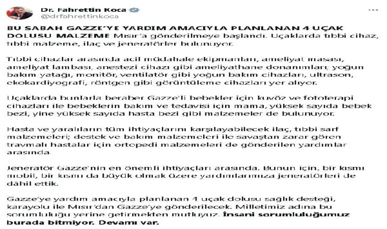 Bakan Koca da sosyal medya hesabından yaptığı açıklamada, Gazze için havalanan uçaklarda tıbbi cihaz, tıbbi malzeme, ilaç ve jeneratörlerin bulunduğunu belirtti. Koca, "Tıbbi cihazlar arasında acil müdahale ekipmanları, ameliyat masası, ameliyat lambası, anestezi cihazı gibi ameliyathane donanımları, yoğun bakım yatağı, monitör, ventilatör gibi yoğun bakım cihazları, ultrason, ekokardiyografi, röntgen gibi görüntüleme cihazları yer alıyor. Uçaklarda bunlarla beraber Gazze'li bebekler için kuvöz ve fototerapi cihazları ile bebeklerin bakım ve tedavisi için mama, yüksek sayıda bebek bezi, yine yüksek sayıda hasta bezi gibi malzemeler de bulunuyor. Hasta ve yaralıların tüm ihtiyaçlarını karşılayabilecek ilaç, tıbbi sarf malzemeleri, destek ve bakım malzemeleri ile savaştan zarar gören travmalı hastalar için ortopedi malzemeleri de gönderilen yardımlar arasında" ifadelerini kullandı.