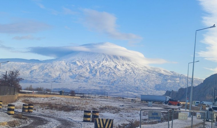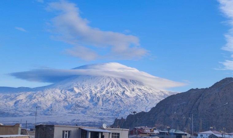 Ağrı’nın Doğubayazıt ilçesinde bulunan ve yüksekliği nedeniyle Türkiye’nin çatısı olarak nitelendirilen, çevresinde kar ve sisin eksik olmadığı, efsanelere de konu olan ve deniz seviyesinden 5 bin 137 metre yükseklikteki Ağrı Dağı’nın zirvesinde oluşan bulut tabakası, şapkayı andıran haliyle adeta kartpostallık bir görüntüye büründü.