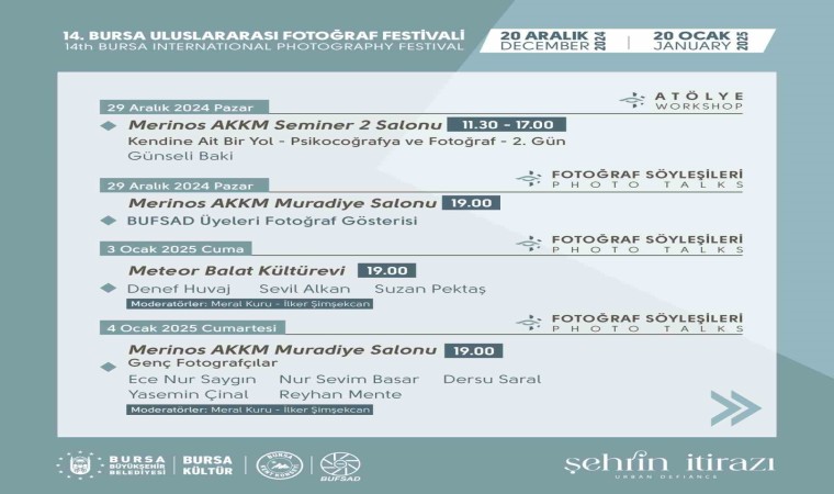 Bursa Büyükşehir Belediyesi’nin, Bursa Kent Konseyi ve BUFSAD işbirliğiyle bu yıl 20 Aralık-20 Ocak tarihleri arasında düzenleyeceği 14. Bursa Uluslararası Fotoğraf Festivali (Fotofest), bir kez daha fotoğraf tutkunlarını Bursa’da buluşturuyor. ‘Şehrin İtirazı’ temasıyla hazırlanan festival kapsamında 33 solo sergi, ulusal ve uluslararası katılımlı grup sergiler, eser sahiplerinin de katılımıyla fotoğraf tutkunlarıyla buluşacak.