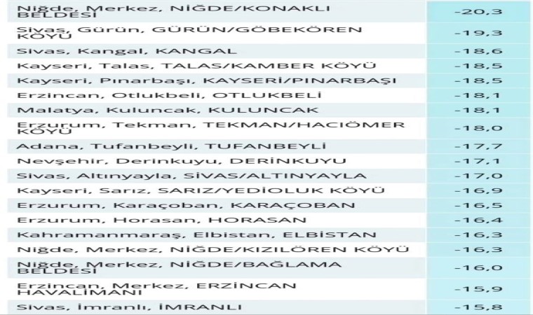 Meteoroloji Genel Müdürlüğü Otomatik Meteoroloji Gözlem İstasyonu il ve ilçelere ait meteorolojik parametrelerde, Türkiye’de gece en düşük hava sıcaklığı şöyle gerçekleşti: