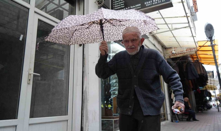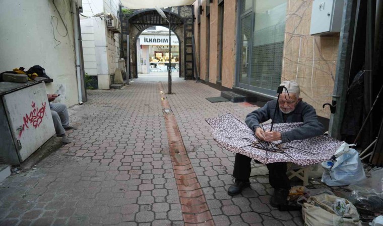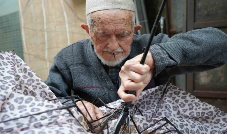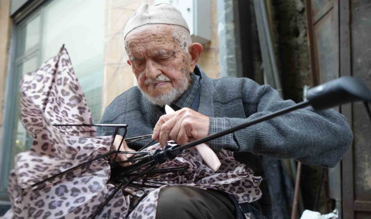 Türkiye’nin en yaşlı şemsiye tamircisi olan 95 yaşındaki Dursun Yıldız, ilerleyen yaşına rağmen gözlük kullanmıyor.