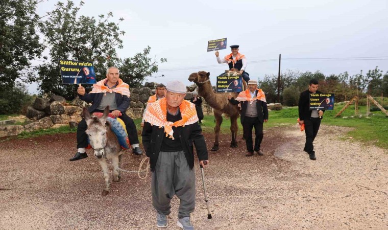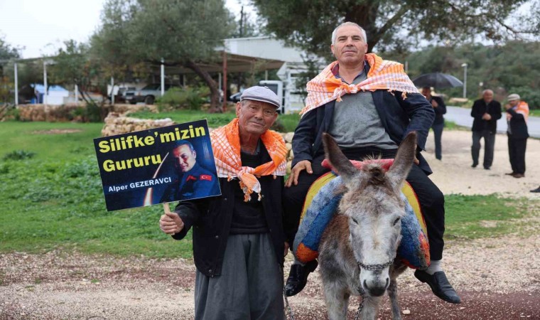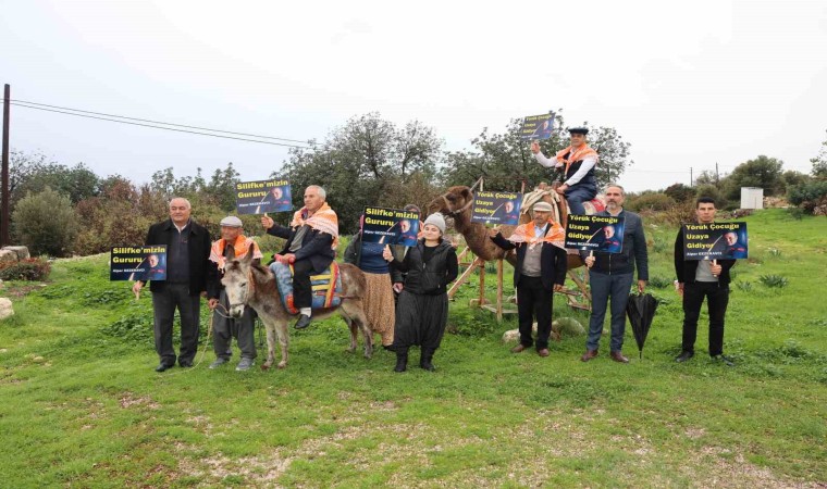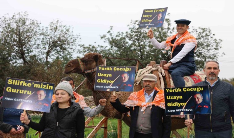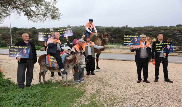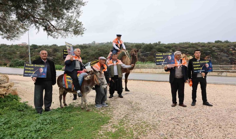 Mersin’in Silifke ilçesinde Yörükler, deve ve eşek sırtında ellerinde dövizlerle yürüyüş düzenleyerek Türkiye’nin ilk uzay yolcusu hemşehrileri Alper Gezeravcı’ya destek verdi.