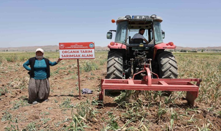 Tarım ve hayvancılık alanında birçok üretimde Türkiye’de ilk 10 sırada yer alan Aksaray’da organik ve GDO’suz sarımsağın hasadı başladı. Geçen yıla oranla bu yıl daha yüksek rekolte veren sarımsaklar tarım işçileri tarafından hasat edilirken, 100 dönüm arazide 200 ton bandında sarımsak elde ediliyor. Üretici Aydın Öngün (66) tarafından üretilen sarımsak bu yıl yağışların yüksek olması nedeniyle yüzleri güldürdü. Babasıyla birlikte tarlalarda hasat yapan Uğur Öngün (33), iklim değişikliği nedeniyle bu yıl hasadın 15 gün önce başladığını belirterek, "2024 sarımsak hasadına başladık şu an. Sarımsaklarımız Türkiye’nin ilk ve tek organik olan sarımsakları. Geçen yıl üretimimiz düşüktü ama bu yıl rekoltemiz biraz daha yüksek. Şu an rekolte olarak ortalama dönüm başına 2 ton bandında. Bu zamana kadar yaptığımız hasatlarda ortalama 1 ton 600 kilo ile 1 ton 900 kilo aldık. Ama hasadın büyük bir bölümü daha hala devam etmekte. Normalde organik sarımsağın geçiş 1-2 ve 3. yıldan sonra tam organiğe geçiyoruz. Bu yıl bizim 7. yılımız ama mevsim şartları ve iklim değişikliği nedeniyle bu yıl biraz daha 15 gün önden geldi. O sebeple bizim ilk etapta biraz tereddütlerimiz vardı rekolte için ama şu an rekolte istediğimizden çok daha üstünde oldu. Sarımsaklarımızı Aksaray’ın ata tohumundan geliştirdiğimiz bir çeşit. GDO’suz ve tam organik olarak üretimimiz devam ediyor. 100 dönüm arazide organik sarımsak üretimimiz var. Rekolte beklentimiz de 200 ton bandında bu yıl inşallah" dedi.