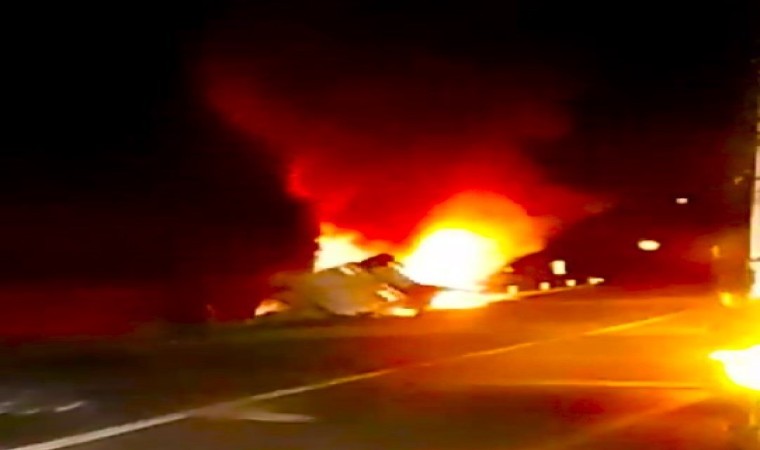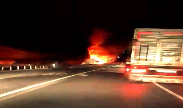 Çankırı’da kontrolden çıkarak devrilen tuz yüklü tır, alev alev yandı.