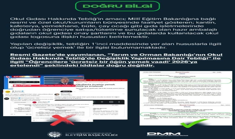 Şaduman TÜRKAY/ANKARA, (DHA)- İLETİŞİM Başkanlığı Dezenformasyonla Mücadele Merkezi, Tarım ve Orman Bakanlığı’nın Resmi Gazete’de yayımlanan, ’Okul Gıdası Hakkında Tebliğde Değişiklik Yapılmasına Dair Tebliği’ ile ’Öğrencilere ücretsiz bir öğün yemek vaadi 2026’ya ertelendi’ iddiasının doğru olmadığını açıkladı.