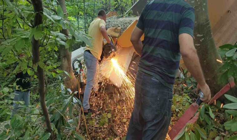 Kabin içerisinde sıkışan sürücüyü kurtarmak için Cide itfaiye ekipleri yaklaşık 5 saat mücadele verdi. Sağlık ekiplerinin de zaman zaman müdahalede bulunduğu sürücü, sıkıştığı yerde uyumak istemesi üzerine itfaiye ekiplerince başına su dökülerek uyutulmamaya çalışıldı.