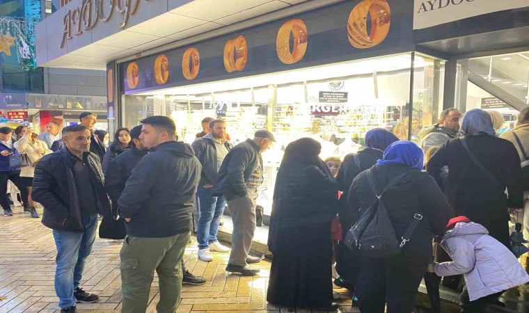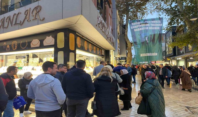 Kocaeli’nin İzmit ilçesi Fethiye Caddesi bulunan bir kuyumcu dükkanında akşam saatlerinde adeta izdiham yaşandı. Altın fiyatlarının düşmesiyle Fethiye Caddesi’ndeki bir kuyumcu esnafı kampanya yaptı. Diğer esnaflardan yaklaşık 150 lira indirim yapan esnafın dükkanı kısa sürede müşteriyle doldu. Esnafın diğer kuyumculardan 150 lira düşük fiyata altın sattığını duyan vatandaşlar, kuyumcu dükkanına adeta akın etti. Yağmurlu havaya rağmen kuyumcu dükkanının önünde uzun kuyruklar oluştu.