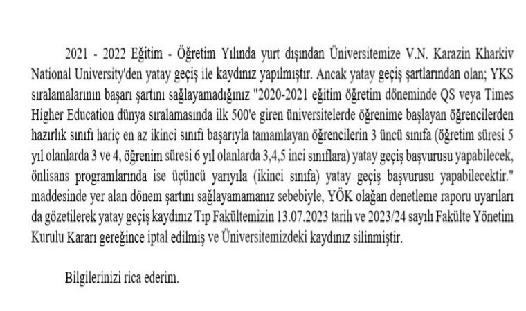 Samsun’un Çarşamba ilçesinde yaşayan Ömer Faruk Aydın ve Metin Doğan Kazanç, Ukrayna’da bulunan V.N Karazin Kharkiv National Üniversitesi Tıp Fakültesi’nde okurken Ukrayna-Rusya savaşı çıktı. Hazırlık ve 1. sınıfı Ukrayna’da okuyan tıp fakültesi öğrencileri Ömer Faruk Aydın ve Metin Doğan Kazanç, Yükseköğretim Kurulu Başkanlığı (YÖK) tarafından kendilerine tanınan yatay geçiş ve özel öğrenci hakkını kullanarak İstanbul’da bir vakıf üniversitesine kayıt yaptırdı. Buradaki özel üniversitede tıp fakültesine 1. sınıftan başlayan öğrenciler, 2. sınıfa geçtikten sonra ’müfettiş’ şokuyla karşılaştı. Müfettiş tarafından yapılan inceleme neticesinde "YKS sıralamalarının başarı şartını ve dönem şartını sağlayamadıkları" gerekçesiyle öğrencilerin kayıtları silindi. Öğrenciler de YÖK’ün sağlamış olduğu şartları karşıladıklarını öne sürerek bu durumu yargıya taşıdı. Doktorluk hayalleri yarım kalan öğrenciler, yetkililerden yardım istedi.
