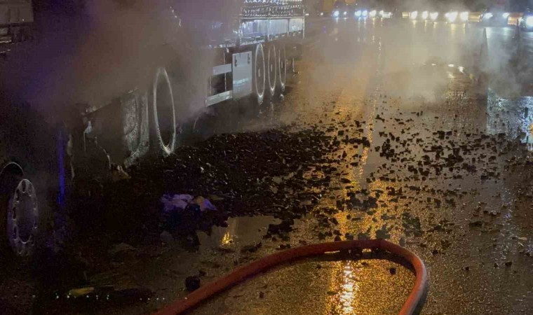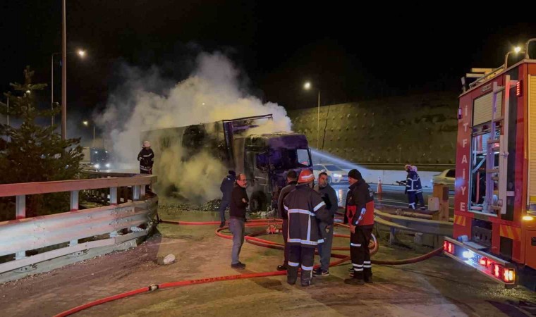 Ukrayna’dan Irak’a kömür taşıyan tır, TEM Otoyolu Bolu Dağı Tüneli girişinde alev alev yandı.
