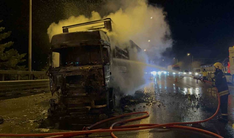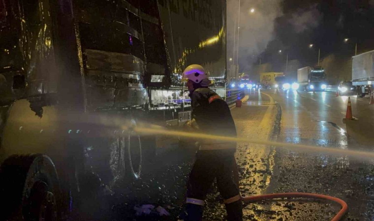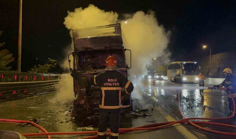 Yangın, TEM Otoyolu’nun Bolu Dağı Tüneli Ankara istikameti girişinde meydana geldi. Edinilen bilgiye göre, Ukrayna’dan Irak’a kömür taşıyan Zafer P. yönetimindeki 27 AFE 699 plakalı kömür yüklü tırın, dorse ile kabinin arasındaki bağlantı kabloları alev aldı. Kısa sürede hem tırın kabinini hem de dorseyi alevler sardı. Durum 112 Acil Çağrı Merkezi’ne bildirildi. İhbar üzerine bölgeye itfaiye, otoyol jandarması ve karayolları ekipleri sevk edildi. İtfaiye ekipleri tarafından yangına müdahale edildi. Alev alev yanan tırın kabini küle döndü. Ekiplerin kömür yüklü dorsede soğutma çalışmaları devam ediyor. Jandarma ekipleri ve karayolları ekipleri tarafından trafik kontrollü olarak tek şeritten sağlandı.