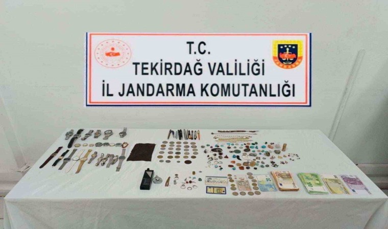Tekirdağ İl Jandarma Komutanlığı ekiplerince Malkara ilçesi Haliç Mahallesinde durdurulan yabancı uyruklu M.M. isimli şahsın yaşa dışı yollardan ülkeye giriş yapmış olduğunun tespit edilmesi üzerine şahsın üzerinde ve eşyalarında arama yapıldı. Yapılan aramada, 1 adet değerli taş ölçüm cihazı, 119 adet taş ve obje, 29 adet eski para, 1 adet yılan derisi, 1 adet sahte kimlik, 6 adet kolye, 25 adet kol saati, 9 adet kalem, 10 bin 430 Euro nakit para ele geçirildi. Malzemelerinin yaklaşık piyasa değerinin 695 bin TL. olduğu öğrenildi. Şüpheli şahıs işlemlerin ardından adli makamlara sevk edilecek.