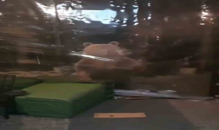 Uludağ’da kış uykusuna yatmayan ve aç kalan ayı ailesi bir işletmeye girmeye çalışırken, o anlar cep telefon kamerasına yansıdı.
