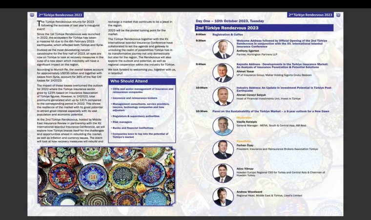 Sigortacılık sektöründe tanıtım ve bilgilendirme faaliyetleri devam ediyor. Dolu dolu geçen Sigortacılık Haftası’nın ardından şimdi de iki gün sürecek uluslararası iki etkinlik düzenleniyor. “2. Türkiye Buluşması 2023” adı altında ilk etkinlik, 10 Ekim Salı günü gerçekleşecek. İlk gün, Huntington Partners LLP Ortağı Anthony Egerton’un açılış konuşması ile başlayacak. Türkiye Sigorta Birliği (TSB) Başkan Yardımcısı ve Maher Holding Sigorta Grubu Başkanı Ahmet Yaşar da, “Türkiye Sigorta Piyasasındaki Gelişmeler: Sigorta Penetrasyonunun ve Potansiyel Çözümlerin Analizi” başlığı altında sunum yapacak. Invest in Türkiye Finansal Yatırımlar Birim Başkanı Ahmet Cüneyt Selçuk’un gerçekleştireceği sunumun başlığı ise ‘Deprem Sonrası Türkiye’de Yatırım Potansiyelinde Güncelleme’ olacak. Sektörün önemli isimlerinin gerçekleştireceği bir dizi konferans ile devam edecek olan etkinlik, iki gün sürecek.