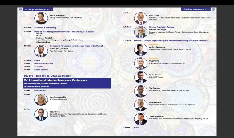 Etkinliğin ikinci gününde ‘15. Uluslararası İstanbul Sigortacılık Konferansı’ düzenlenecek. Sigorta Tatbikatçıları Derneği (STD) Başkanı Fahri Altıngöz, sigortacıları konferansa davet etti. Altıngöz, “Sigorta Tatbikatçıları Derneği tarafından düzenlenen ‘Maraş Depremi, Sonuçları Ve Öğretileri ile 2024 Yılı Reasürans Yenilemeleri’ konulu konferansımız, 11 Ekim 2023 Çarşamba günü 09.30-16.30 saatleri arasında Hilton İstanbul Kozyatağı’nda fiziki olarak gerçekleşecektir. Konferansımıza ülkemizden ve yurt dışından çok kıymetli konuşmacılar katılacak olup, tüm sektöre önemli bilgilendirmeler, sunumlar yapacaklardır” dedi.