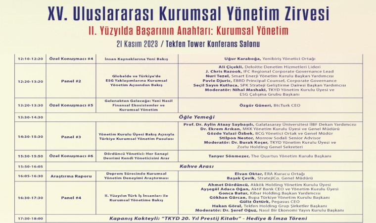 Program kapsamında 4 farklı panelin düzenleneceği ve özel konuşmacıların yer alacağı XV. Uluslararası Kurumsal Yönetim Zirvesi’nde ulusal ve uluslararası alandan birçok iş insanı bilgi ve birikimlerini katılımcılara aktaracak. Zirvede TKYD’nin 20. Yılına ilişkin prestij kitabının lansmanı ve ardından kapanış kokteyli gerçekleşecek.