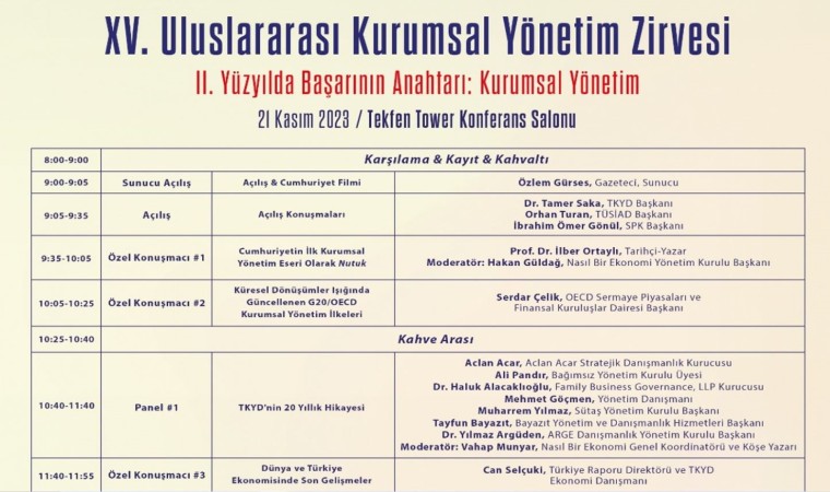 15’inci Uluslararası Kurumsal Yönetim Zirvesi’nin ana teması, ‘2. Yüzyılda Başarının Anahtarı: Kurumsal Yönetim’ olacak. Zirve aynı zamanda Cumhuriyet’in 100. yılına ve TKYD’nin 20. yılına özel olarak gerçekleştirilecek. Açılış konuşmalarını TKYD Yönetim Kurulu Başkanı Dr. Tamer Saka, SPK Başkanı İbrahim Ömer Gönül ve TÜSİAD Başkanı Orhan Turan’ın yapacağı zirvede, ekonomi yazarları Hakan Güldağ, Vahap Munyar ve Dr. Şeref Oğuz da moderatörlük yapacak.