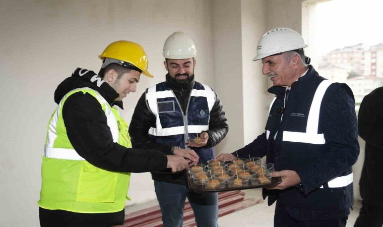 Şantiye gezisinin sonunda Başkan İsmet Yıldırım, inşaatın çalışanlarına teşekkür ederek, tatlı ikram etti.