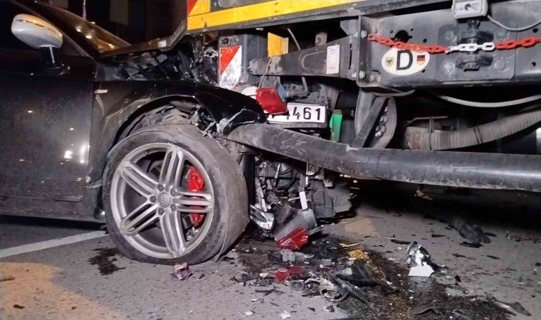 Ümraniye’de seyir halindeki otomobil virajı alamayarak yolun sağında park halinde olan vince çarptı. Kazada ölen veya yaralanan olmazken lüks otomobilde büyük maddi hasar oluştu.