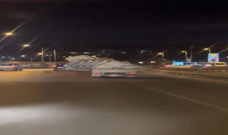 Ümraniye'de yatak yüklü kamyonetin tehlikeli sürüşü sırasında çevredekiler tarafından cep telefonu kamerasıyla kaydedildi. Şile Otoyolu Üsküdar istikametinde ilerleyen 34 HA 4280 plakalı kamyonet sürücüsü, kasasından sarkan çuvallar ve yatakları umursamadan yoluna devam etti. Kamyonetin kasasından taşan yataklar, hem kamyonet şoförünün hem de aynı yönde seyreden diğer sürücülerin güvenliğini tehlikeye attı. Bu anlar, çevredeki sürücüler tarafından cep telefonu kamerasıyla kaydedildi.