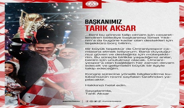 Ümraniyespor’un sosyal medya hesabından ayrılıkla ilgili açıklama yapan Başkan Tarık Aksar, "Saygıdeğer Ümraniyeliler, bugün sizlere, 4 yıldır gururla hizmet ettiğim Ümraniyespor Başkanlığı görevimden ayrılma kararı aldığımı bildirmek istiyorum. Bu kararı almamda, kulübümüzün 83 yıllık tarihinde ilk defa Süper Lig’e çıkma onurunu yaşadığımız günden bu yana geçen süre boyunca maddi ve manevi olarak büyük bir yorgunluğa ulaşmam etkili olmuştur. Bu süreçte beni destekleyen ve yanımda olan tüm yöneticilerimize, sportif direktörlere, teknik ekiplere, kulüp personelimize ve aileme derin bir minnettarlık duyuyorum. Ümraniyespor’un başarısı için yaptığınız fedakarlıklar ve emekler takdiri hak ediyor. Sizlerin desteği olmadan bu süreci başaramazdık ve gururla söyleyebilirim ki, hep birlikte büyük başarılara imza attık. Beni bu göreve talip olmam için cesaretlendiren belediye başkanımız İsmet Yıldırım’a da bugüne kadar olan destekleri için teşekkürü borç bilirim. Bir büyük teşekkür de Ümraniyespor camiasına etmek istiyorum. Bana duyduğunuz güven ve desteğiniz için müteşekkirim. Bu süreçte birlikte yaşadığımız anılar, benim için unutulmaz olacak. Ümraniyespor’a bağlılığım her zaman devam edecek ve gelişmeleri büyük ilgiyle takip edeceğim. Kongre sürecine yönetim bilgilendirme kulübümüzün resmi sayfaları tarafından yapılacaktır. Hakkınızı helal edin” dedi.