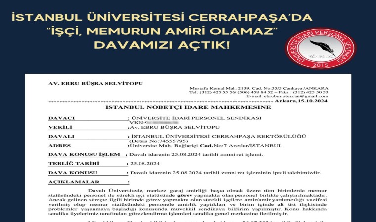 Üniversite İdari Personel Sendikası (ÜNİ-PER-SEN), işçi statüsündeki personelin bir memurun amiri olmasının hukuken mümkün olmadığını belirterek, İstanbul Üniversitesi Cerrahpaşa’daki görevlendirmeler nedeniyle hukuki süreç başlattı.