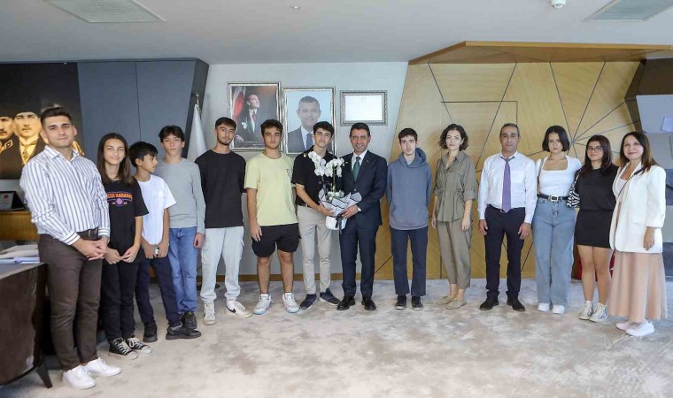 Bayraklı Belediyesi Sosyal Etkinlik Merkezi’nde eğitim alarak üniversite ve liseye giriş sınavlarında başarılı olan öğrenciler, Bayraklı Belediye Başkanı İrfan Önal’ı makamında ziyaret ederek, desteklerinden dolayı teşekkür etti.