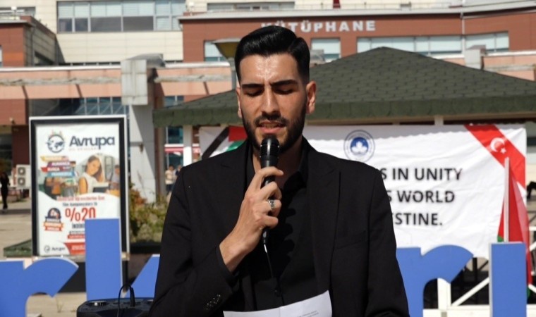 Üniversitenin İlahiyat Kulübü Başkanı Eyüp Başaran topluluk adına basın açıklaması yaptı. Başaran, İsrail’in saldırılarının Gazze ile sınırlı kalmadığını belirterek Lübnan ve Yemen’e sıçradığını söyledi.