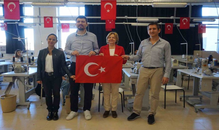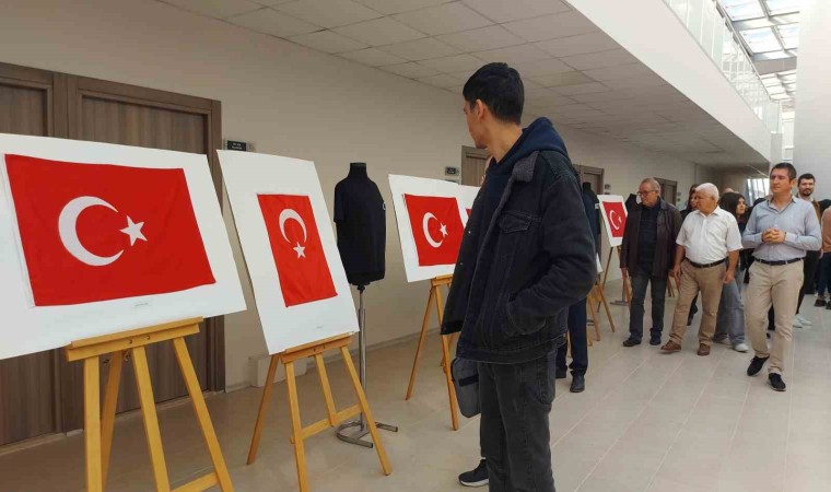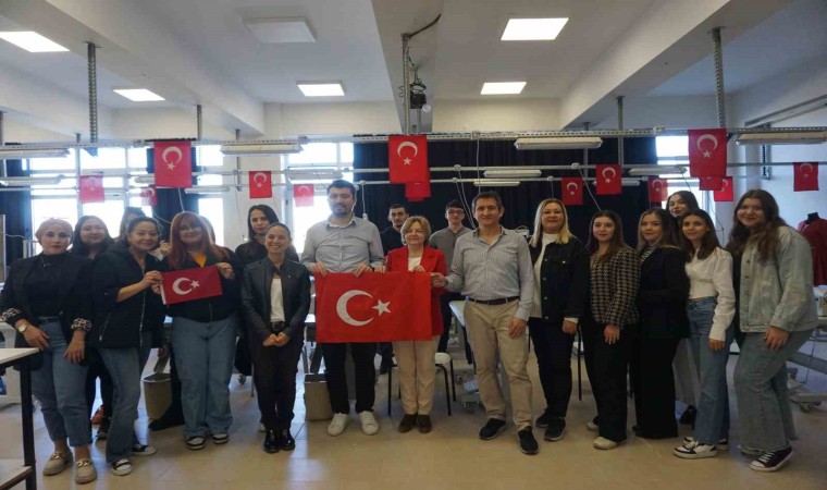Trakya Üniversitesi Teknik Bilimler Meslek Yüksekokulu Giyim Üretim Teknolojisi Bölümü öğrencileri ve öğretmenleri tarafından Cumhuriyet’in 100. yılına özel dikilen Türk bayrağı ve tişörtler, okulun koridorunda sergilendi.