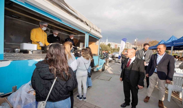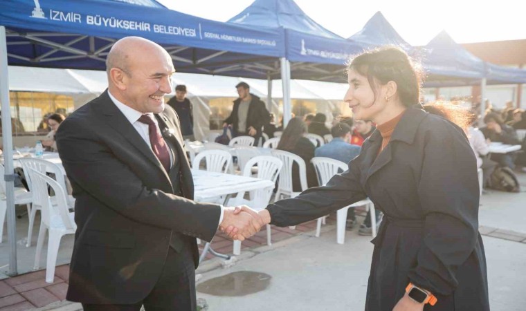 Ziyarette konuşan Başkan Soyer, “Bir kere gençlerin içinde nefes alıyorum. En çok mutlu olduğum yer onların yanı. Gerçekten onlarla beraber olmaktan muazzam bir keyif alıyorum. Katip Çelebi Üniversitesi’nin içindeyiz. Burada günde yaklaşık 750 öğrencimize sıcak yemek servisi yapıyoruz. İzmir’in üniversitelerinde bu uygulamayı başlatmıştık. Katip Çelebi’de de bu işi sürdürüyoruz. Geçen sene kapının dışında yemek veriliyordu. Bu sene rektörlük izin verdi ve içeride hizmet veriyoruz. Çok iyi oldu. Çadırlarla çocukları biraz daha soğuktan koruyan bir şekilde hizmet veriyoruz. Sordum, soruşturdum, çok memnunlar” diye konuştu.
