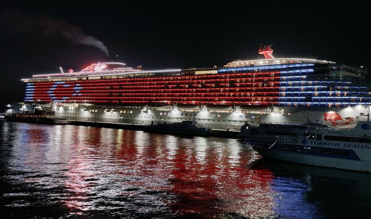 Muğla’nın Bodrum ilçesine gelen Resilient Lady isimli dev yolcu gemisi, 2 bin 63 yolcu getirdi. Ünlü İngiliz iş adamı, yazar ve ticari astronot Richard Branson’a ait geminin ışıkları Türkiye Cumhuriyetin 100’üncü yılı nedeniyle Türk bayrağını yansıttı.