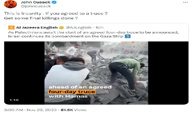 Beril SÖNMEZ, (DHA) – Ünlü ABD’li oyuncu John Cusack, İsrail ile Hamas arasında başlaması beklenen 4 günlük duraklama öncesinde İsrail’in dün akşam yaptığı bombardımana tepki gösterdi. Cusack “Eğer ateşkesi kabul ettiyseniz son öldürmeleri mi hallediyorsun?” diye sordu.